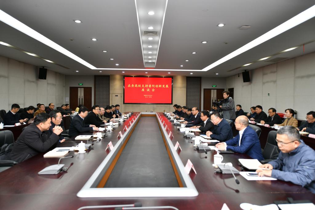 当前,舟山正处在创新发展、转换动能、建设重要窗口海岛风景线关键时期。为更好地适应社会需求、服务改革发展,深化校地合作,推动创新发展,切实发挥高校智引作用,12月4日下午,在舟高校支持普陀创新发展座谈会在普陀区举行,我校党委书记苏为泽带领校党委委员、副校长夏志刚,学校科研处、航海工程学院等部门负责人出席了会议。普陀区委书记张立军,区委副书记、代区长徐炜波等四套班子主要领导,以及其他在舟高校主要负责人参加了会议。