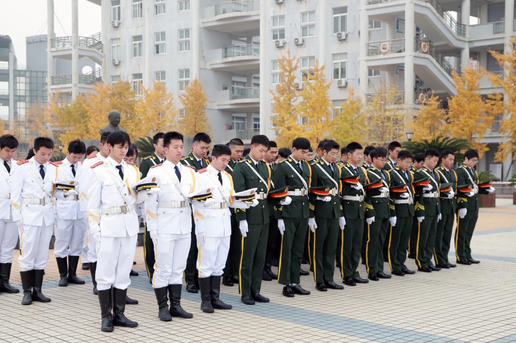 12月13日,航海工程学院国旗护卫队在国旗下举行了庄严肃穆的升旗和降半旗仪式。