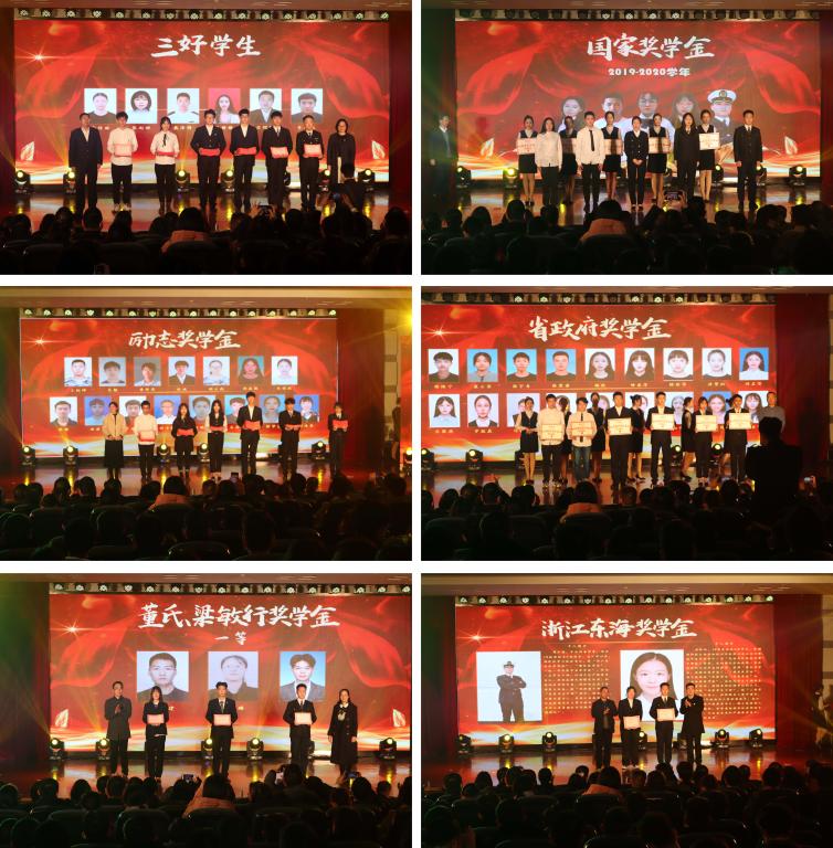 本次表彰大会对获得国家奖学金、国家励志奖学金、省政府奖学金、优秀学业奖学金、专业技能奖学金、董氏梁敏行奖学金、东海教育基金会奖学金、浙江东海奖学金等8大类奖学金的969名学生,对获得三好学生、优秀学生干部、工作积极分子等荣誉称号的365名学生、19个“先进班级”荣誉称号、8个“示范寝室”荣誉称号的先进集体进行了表彰。