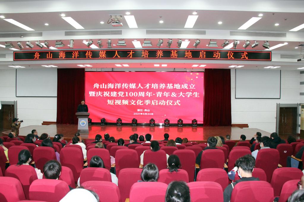 3月24日,舟山海洋传媒人才培养基地成立暨庆祝建党100周年·青年&大学生短视频文化启动仪式在学校董浩云图书馆四楼报告厅成功举行。中共舟山市委宣传部副部长朱永华,舟山市文联党组书记张辉,共青团舟山市委副书记崔俊杰,舟山日报社副总编辑、舟山市电影电视艺术家协会主席吴崇杰,我校党委副书记、校长吴中平,党委委员、副校长曹志斌,党委委员、副校长夏志刚,以及部分市级机关相关部门领导和舟山市电影电视艺术家协会理事以上艺术家、企业家和学校师生代表共150余人参加。启动仪式由党委委员、副校长夏志刚主持。