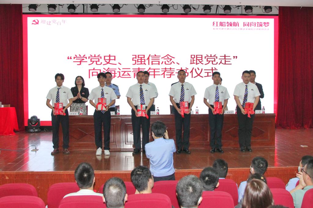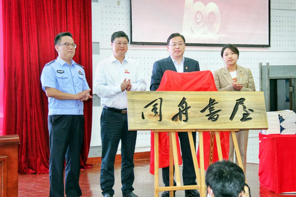 随后,招商银行浙江自贸试验区舟山分行、舟山市公安局经侦支队、舟山银保监分局和学校领导,共同为“同舟书屋”揭牌,并举行了“学党史、强信念、跟党走”海运青年荐书仪式。