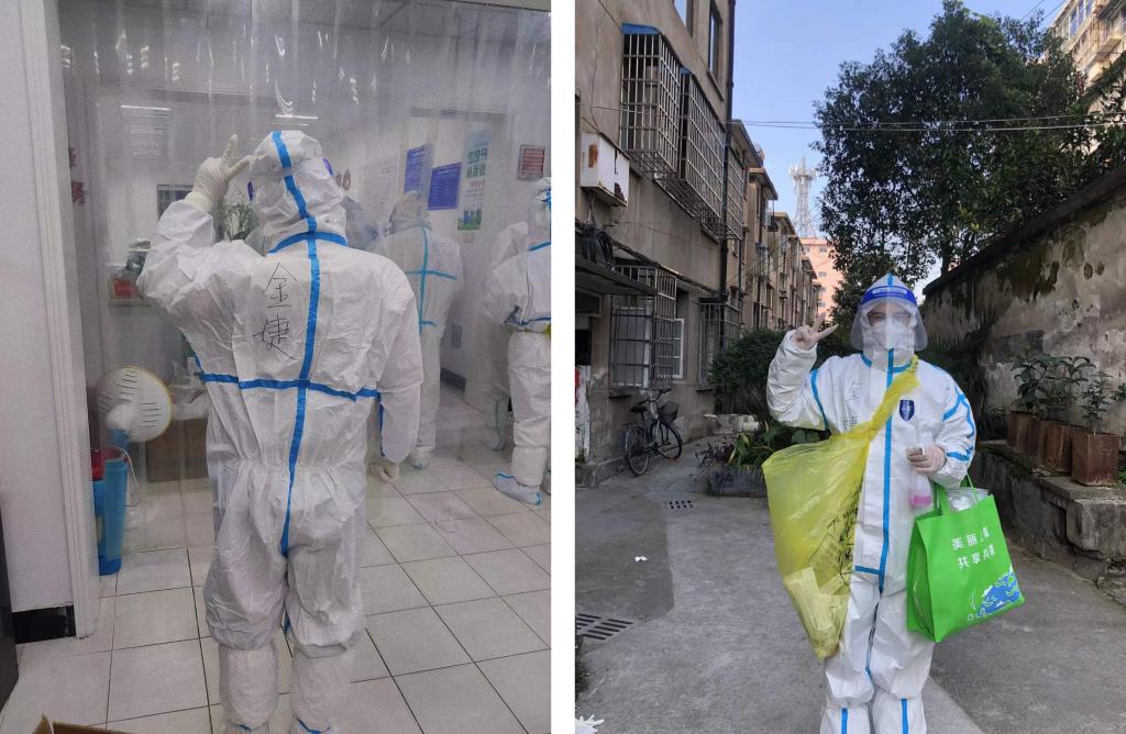 金婕家住绍兴上虞百官街道龙山社区,刚好处于本次的疫情高风险区。在社区开始招募志愿者时,她毫不犹豫地报名参加,协助医生上门为居家隔离居民采集核酸样本。