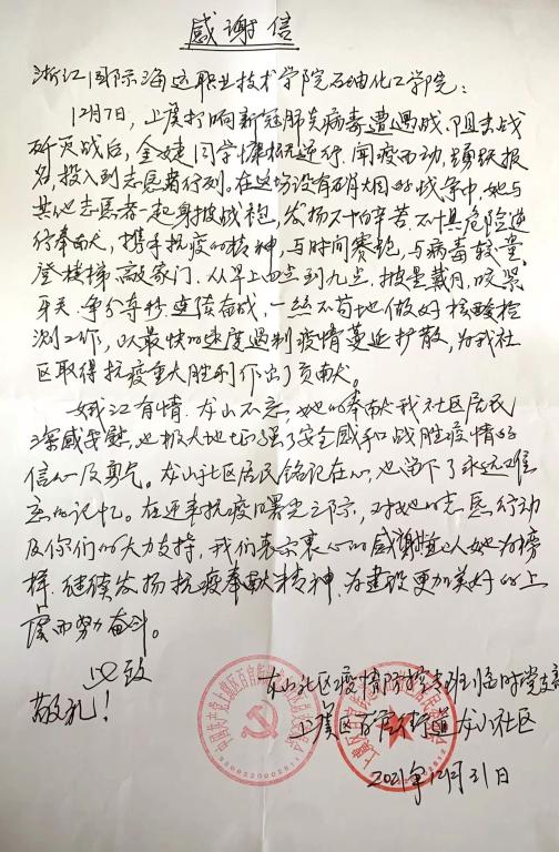 新年伊始,石油化工学院收到一份来自于绍兴上虞区百官街道龙山社区党支部的感谢信,信中对学院2019级石油炼制技术1班的金婕同学在此次绍兴上虞抗击新冠肺炎疫情期间慷慨逆行、不惧危险、携手抗疫的担当作为表示感谢与赞赏。