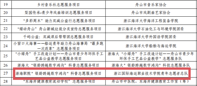 在2022年“舟山有你·越来越好”志愿服务集市创投活动中我校共申报志愿服务项目6个,3个获市级立项。其中,学校青年志愿者总队的“银龄跨越数字鸿沟”科普志愿服务项目和港口管理学院的女子交通队文明交通劝导志愿服务项目被舟山市精神文明建设委员会办公室、共青团舟山市委员会、舟山市志愿者协会立项;海洋装备工程学院“同舟基金”志愿服务队的“健康科普促成长,倡导文明新读者”慈善志愿服务项目被舟山市慈善总会、共青团舟山市委立项。