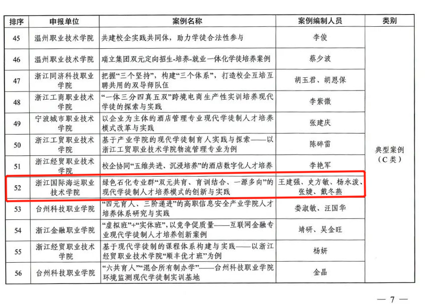 近日,浙江省中华职业教育社、省教育厅和人社厅联合发布《关于2021年浙江省学徒制典型案例评选结果的通知》,全省高职院校共评选了60个典型案例。我校《高质量培养国际海员,服务海洋强国战略》与《绿色石化专业群“双元共育、育训结合、一源多向”的现代学徒制人才培养模式的创新与实践》入选典型案例。