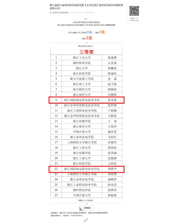 我校及时启动,精心组织,广泛发动在校生积极参与网络练习,经过二级学院选拔推荐,对种子选手进行集中加练,经过校赛选拔推荐、省网络答题赛,最终海洋装备工程学院邵菲艳和周烨华2人入围半决赛,并在45名参赛选手中脱颖而出,均获得浙江省总决赛三等奖的好成绩。(校团委)