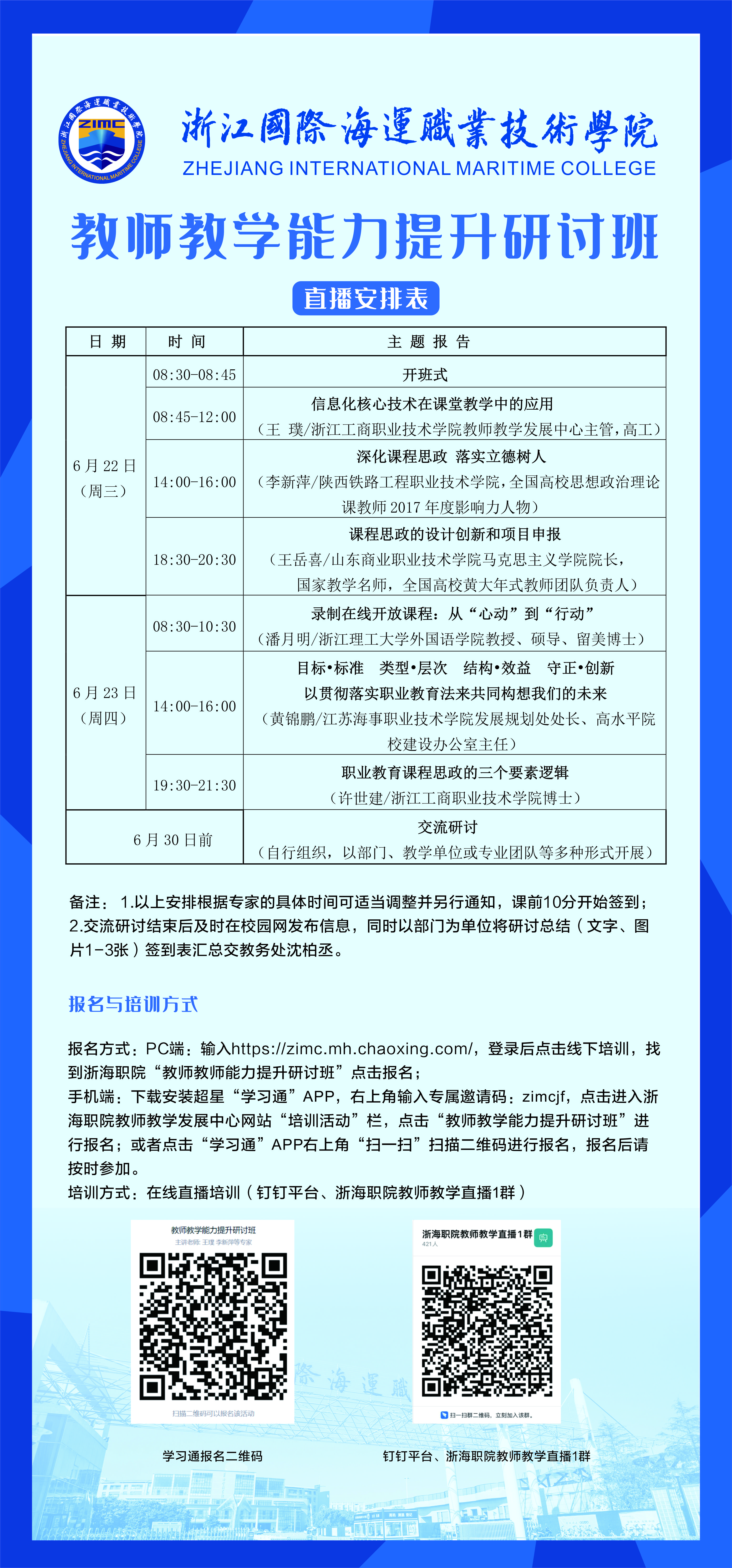 为深入学习贯彻习近平总书记关于职业教育的重要论述精神,学习领会、贯彻落实新修订《职业教育法》,牢固树立科学的职业教育理念,研学教育教学数字化改革、交流课程思政建设,拓宽教师职业教育教学改革与创新的思路和方法,提升教师教学的业务素质和能力,6月22日-23日,由学校教师教学发展中心举行的“教师教学能力提升研讨班”在钉钉直播群顺利举行。研讨班开班议式由教务处处长史方敏主持。