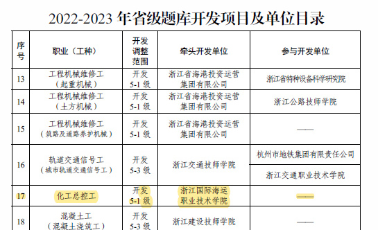 为进一步加强技能人才评价技术资源建设,满足技能等级认定工作需要,近日,浙江省人力资源和社会保障厅发布了《2022-2023年浙江省技能人才评价省级题库开发项目及单位》的通知,公布了省级题库开发职业名称、开发范围、牵头开发单位和参与开发单位。我校成为“化工总控工”新职业(工种)省级题库开发牵头单位,开发范围为1-5级(初级工、中级工、高级工、技师、高级技师)。