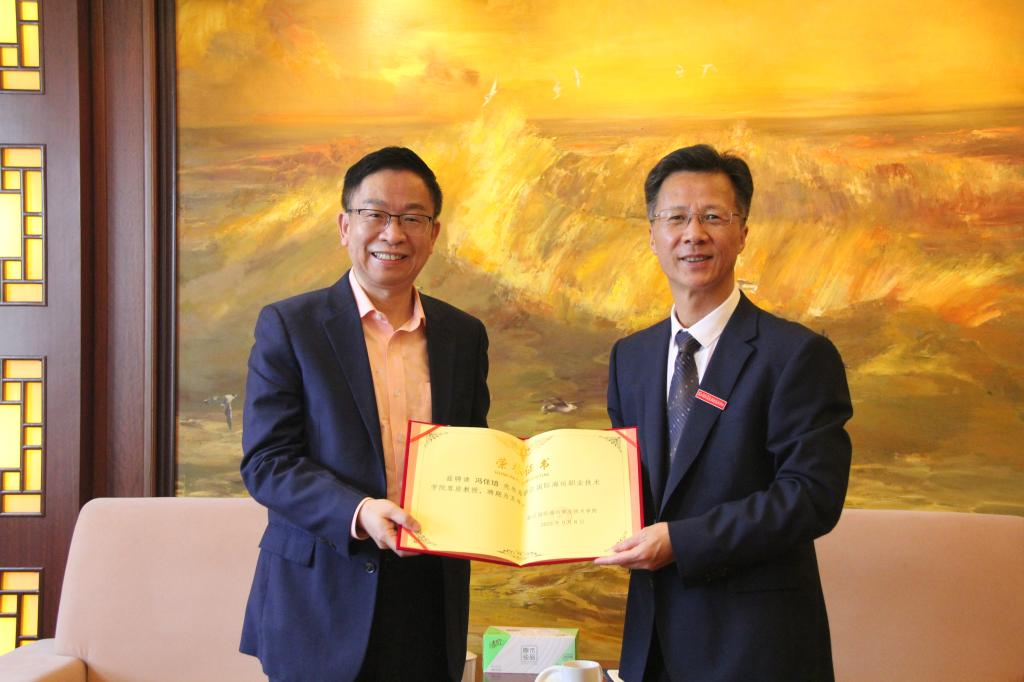 学校还聘任冯佳培先生为客座教授,吴中平校长为冯佳培先生颁聘任证书。