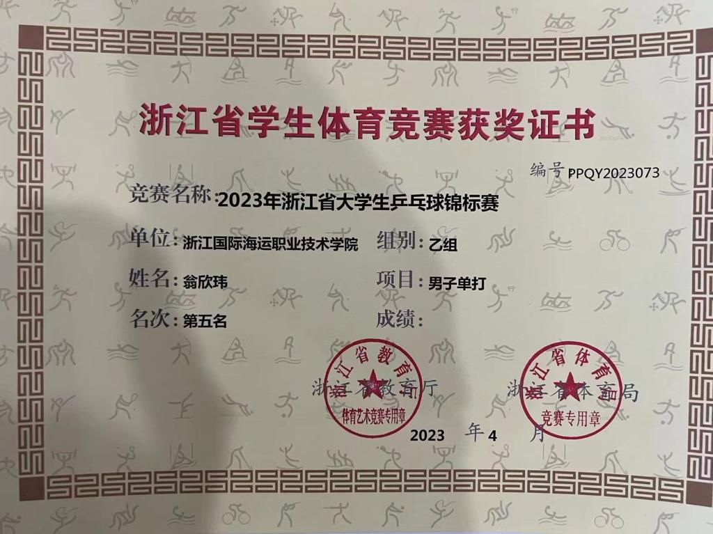 在教练包海丽老师的悉心指导下,我校海洋旅游学院2020级国际乘务管理专业的翁欣玮同学参加了男子单打赛项。比赛中,翁欣玮同学与来自全省的37名选手同台竞技,不畏强手,沉着冷静,做到每球必争,凭借永不放弃的拼搏精神,五战四胜,最终荣获第五名的好成绩,并获得“优秀运动员”称号,创造了我校在省级乒乓球个人比赛的最好成绩。(文化体育部)