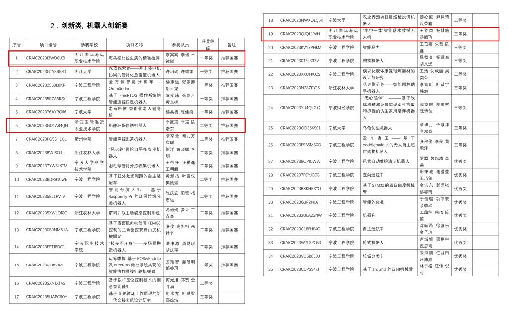 本次大赛有来自浙江大学、杭州电子科技大学、宁波大学、浙江交通职业技术学院等省内40余所高校600多支队伍参加。参赛的近八成选手来自本科院校,我校共有3支队伍参加该项赛事的机器人创新赛。通过项目申报、路演答辩,最终由海洋装备工程学院苗家明、张学俊老师指导,求宾宾、李瑶、王镜骐三名同学的《海岛松材线虫病的精准监测》项目,荣获一等奖,并推荐国赛;海洋装备工程学院杜叶挺,应泽光老师指导,李露瑶、李瑶、陈浩东三名同学的《船舶环保除锈机器人》项目,荣获二等奖,并推荐国赛;海洋装备工程学院于朋涛老师指导,王铭杰、杨婕施、游腾飞三名同学的《“水空一体”智能落水救援无人机》项目,荣获三等奖。