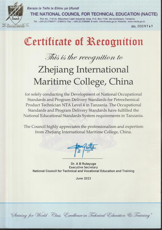 2023年6月,由我校主持、参与的坦桑尼亚职业标准和配套专业教学标准轮机工程技术员4级、轮机工程技术员6级、船舶电子电气技术员4级、船舶电子电气技术员5级、船舶电子电气员6级、石油化工产品技术员4级等6个项目获得坦桑尼亚国家教育委员会认证,正式纳入坦桑尼亚国家职业教育体系。