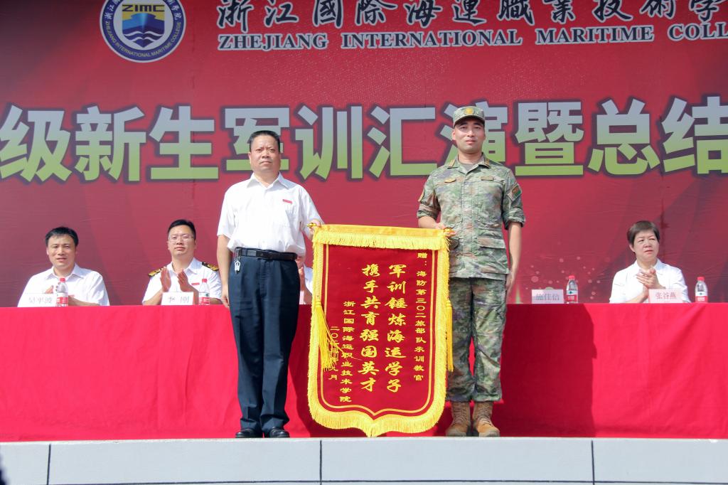 校党委委员、工会主席刘相对军训和会操表演取得圆满成功表示祝贺,代表学校向承担本次军训任务的全体承训教官送上了“军训锤炼海运学子 携手共育强国英才”的锦旗,表达了学校对部队教官的感谢之情。