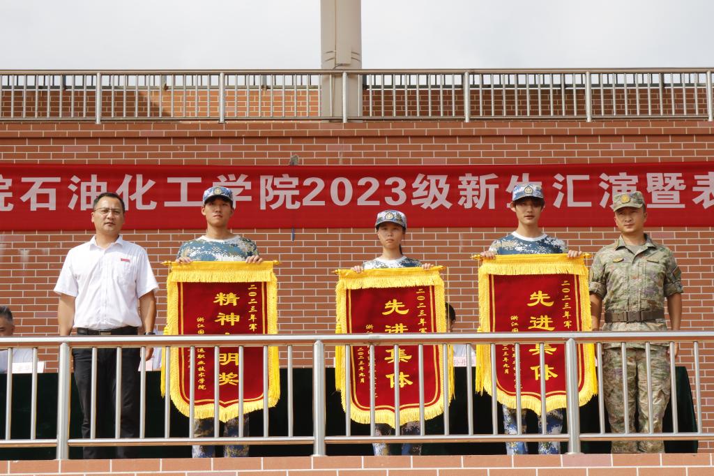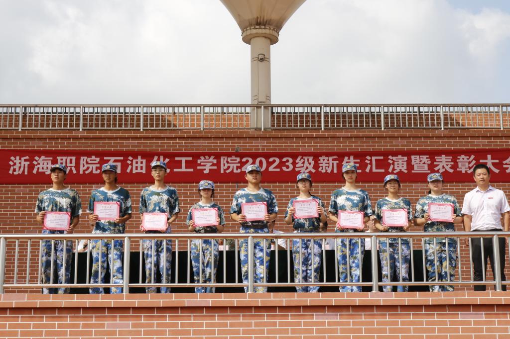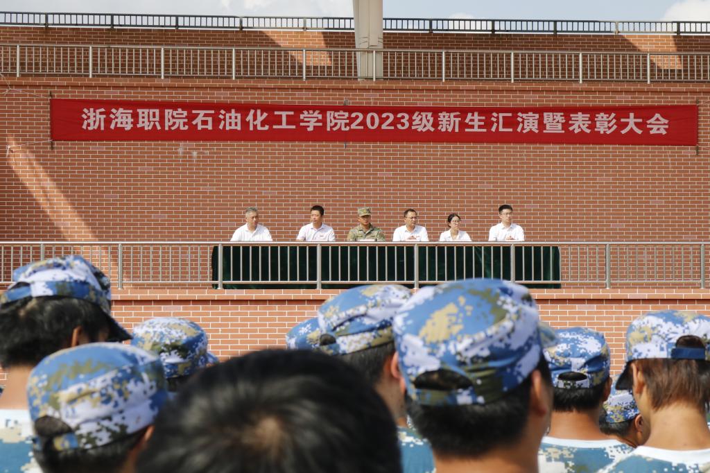 当天上午,岱山校区也在田径场顺利举行了2023级新生军训汇演暨总结表彰大会,石油化工学院全体班子成员、承训部队领导、全体参训师生参加。(学生处、石油化工学院)