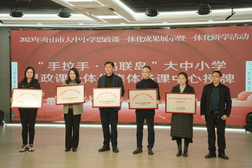 现场会上,舟山市教育局党委委员、总督学、市大中小学思政课一体化建设指导委员会常务副主任邵伟康将“岛联岛·手拉手”大中小学思政课一体化集体备课中心牌匾授给我校马克思主义学院,将“手拉手”大中小学思政课一体化集体备课中心牌匾授给定海、普陀、岱山、嵊泗等四个县区。
