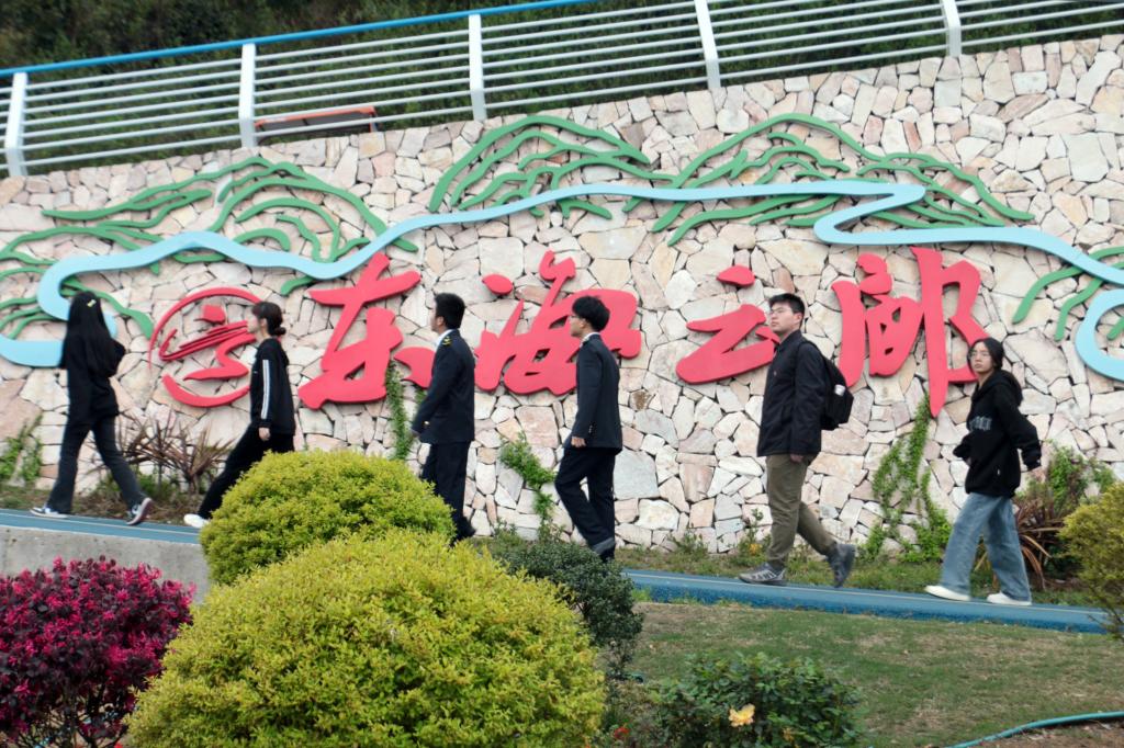 随后,师生代表们一起来到鸦片战争遗址公园。大家沿着东海云廊竹山段步道缓步而上,重温了鸦片战争爆发、定海官兵抵抗入侵等历史事件,陆续瞻仰了褒扬三总兵气节的“三节源”、重现烽火硝烟的海战图等纪念点,切身感受到中华民族在逆境中顽强挺立、坚贞不屈的民族意志和决心。