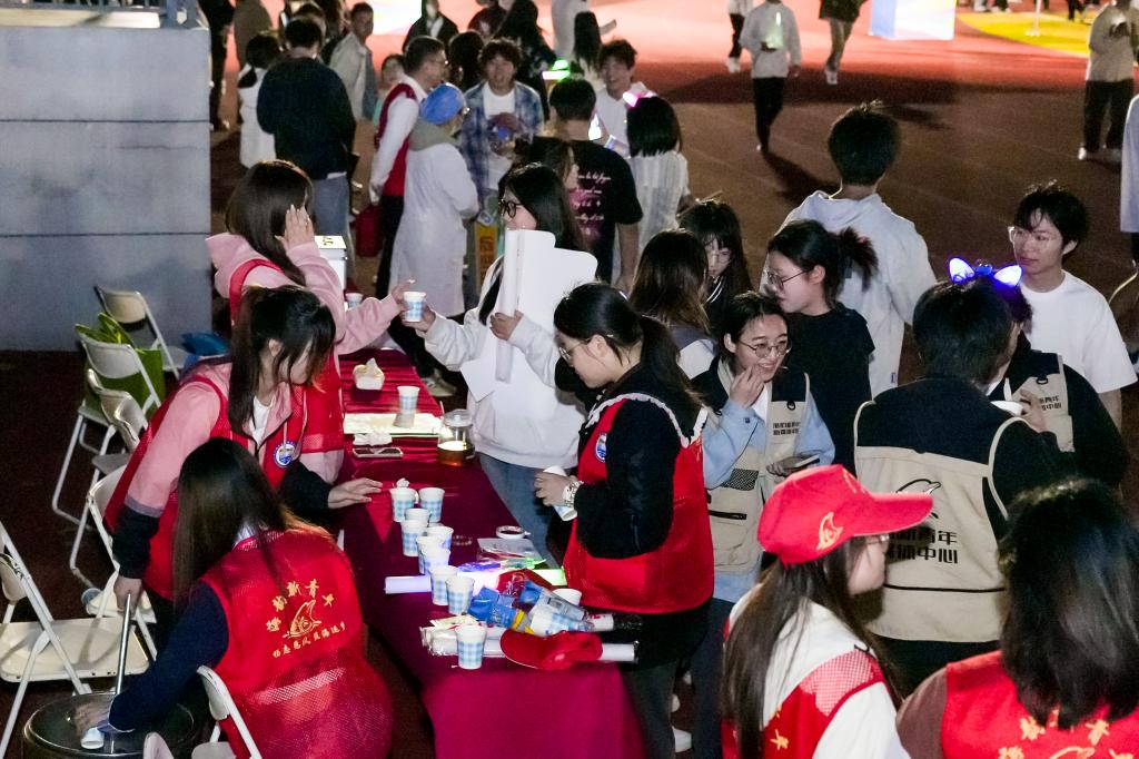 团市委书记陈涛、校党委副书记孔志光等10位领导鸣起跑枪,与近1000名同学一起携手出发,围绕学校操场燃情开跑。大家手持荧光棒,头戴发光发箍,勇往直前,感受音乐与运动的双重律动,合奏名为青春的盛大乐章。活动中,后勤产业处还为同学们准备了姜茶,为奔跑后的同学们解渴。