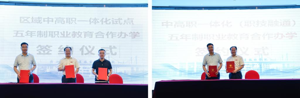 在签约仪式环节,孔志光副书记分别与9所中职学校签订了“中高职一体化五年制职业教育合作办学协议”、与2所中职学校签订了“区域中高职一体化试点五年制职业教育合作办学协议”、与舟山技师学院签订了“中高职一体化(职技融通)五年制职业教育合作办学协议”。