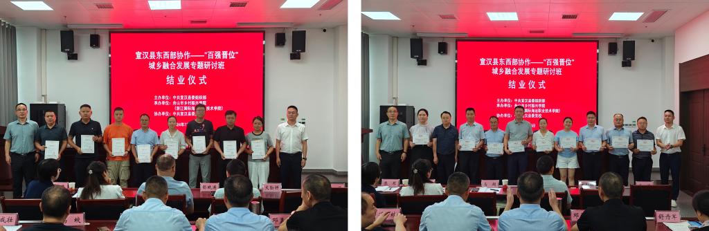 7月1日-5日,由中共宣汉县委组织部主办,学校东海教育学院承办的宣汉县东西部协作——“百强晋位”城乡融合发展专题研讨班在中共宣汉县委党校圆满结束。本次研讨班旨在深入贯彻宣汉县委县政府“城乡融合发展年”工作要求,助力“牛药果茶菌”特色产业健康发展,筑牢城乡融合发展和人力支撑。宣汉县委常委、副县长叶仙富,副县长潘刚,舟山市乡村振兴学院执行副院长、学校党委委员、副院长夏志刚,舟山市乡村振兴学院秘书长、职业培训中心主任苏峰出席开班仪式。仪式由宣汉县委组织部副部长、公务员局局长(兼)向进主持。