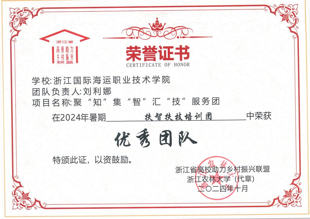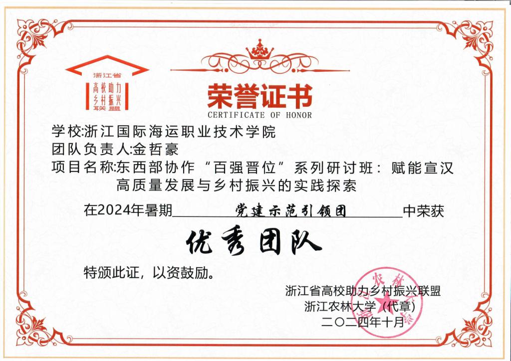 近日,浙江省高校助力乡村振兴联盟公布了2024年浙江省高校暑期服务乡村振兴工作评选结果,我校海洋旅游学院申报的聚“知”集“智”汇“技”服务团荣获扶智扶技培训团优秀团队。校乡村振兴学院申报的东西部协作“百强晋位”系列研讨班:赋能宣汉高质量发展与乡村振兴的实践探索服务团荣获党建示范引领团优秀团队。