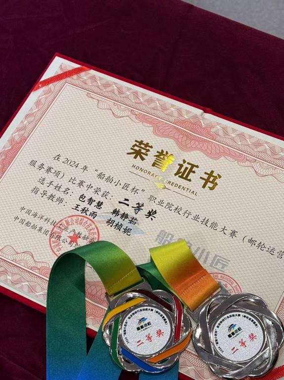 11月8日-10日,2024年“船舶小匠杯”职业院校行业技能大赛(邮轮运营服务赛项)在武汉交通职业学院顺利举行,来自全国15所院校的30名选手同台竞技。海洋旅游学院2023级国际邮轮乘务管理专业的包智慧、韩静茹两位选手,经过激烈角逐,最终荣获二等奖的优异成绩;指导教师王秋雨、胡桢妮荣获“优秀指导教师”奖。