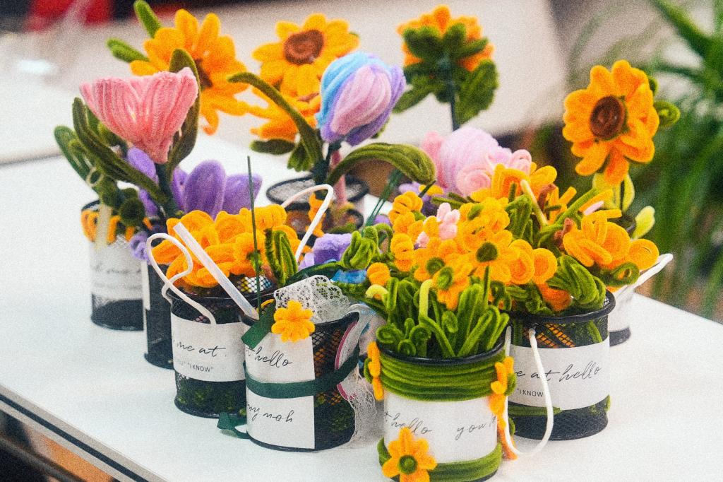 同学们对照网络教程自学,一根根普通的扭扭棒在她们手中仿佛拥有了生命,通过巧妙的扭、折、粘,一朵朵充满创意的手工花在指尖绽放,一个个精美的花束造型逐渐成型,他们用巧手与创意开展了一场春日手工之约。