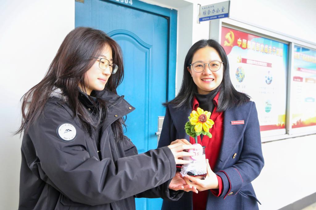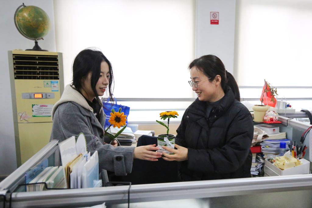 课间时分,同学们将精心制作的扭扭棒花束和贺卡亲手送给学院的女神们,借这一份份充满创意又温馨的礼物,表达了对女老师们平日里辛勤付出的感恩之情,希望老师们能感受到如春天般的温暖和幸福。