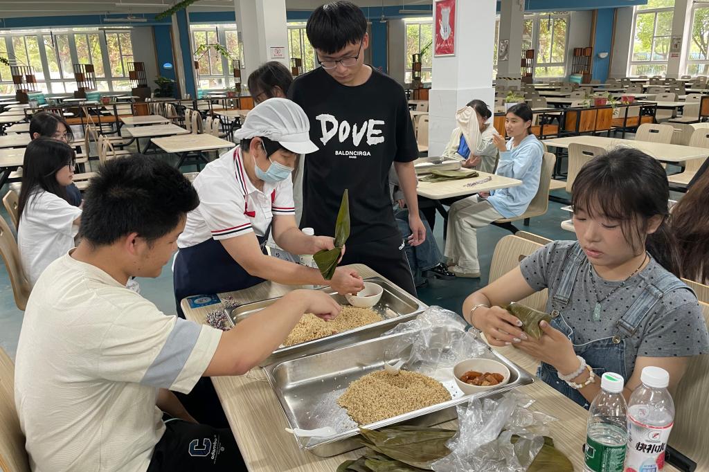 当天下午,活动参与者们齐聚学生食堂,以4-6人为一组,他们个个摩拳擦掌,各自挑选了甜、咸糯米,咸蛋黄、鲜肉、红枣、豆沙等馅料,在工作人员的细致教授下,同学们逐渐掌握了包粽子的要领,一个个或小巧或饱满的粽子逐渐成型,再扎上五彩的绳线,心中是满满的成就感。活动结束后,同学捧着蒸熟的粽子,眼里满是欣喜,纷纷表示要带回寝室送给自己的室友尝一尝。