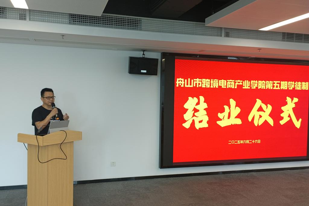 仪式上,王贵斌院长致辞。他首先向舟山甬创产业园管理有限公司和舟山同泽科技有限公司表达了诚挚的感谢,感谢两家企业为学生提供了宝贵的实战机会,让学生能够在真实的工作环境中锻炼自己,同时也感谢企业导师们的辛勤指导,助力学生成长。王贵斌院长对第五期特色学徒制的同学们给予了高度评价,称赞他们在项目期间展现出了专业的素养、学习能力和团队协作精神。他鼓励同学们在未来的职业道路上,继续保持积极进取的态度,为跨境电商行业的持续健康发展贡献自己的力量。