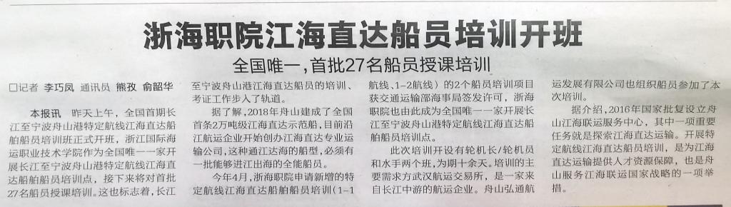 《舟山晚报》:首期特定航线江海直达船员培训开班