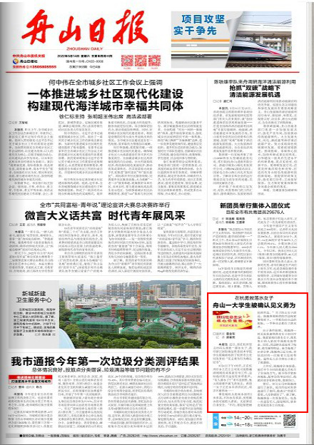 《舟山日报》:在杭勇救落水女子 舟山一大学生被确认见义勇为