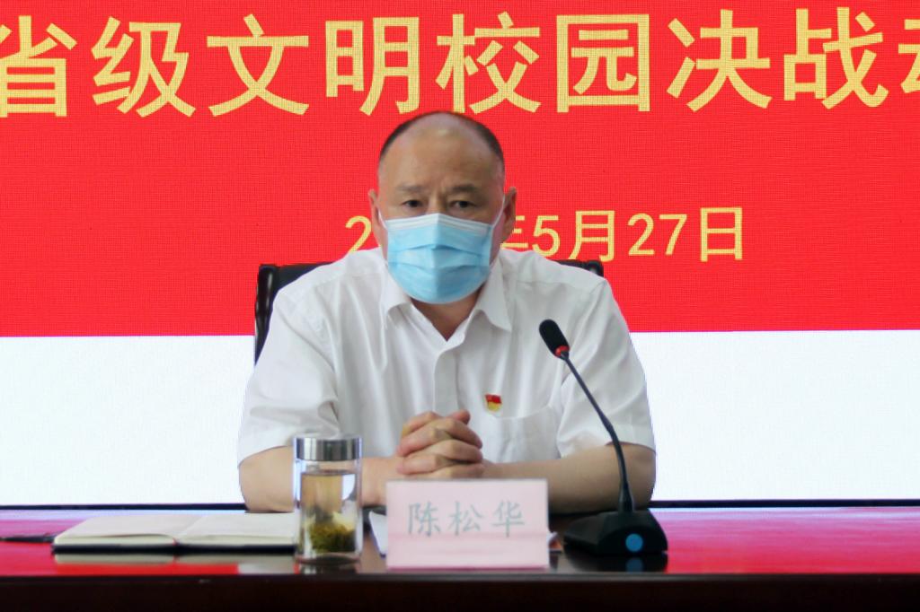 党委书记陈松华作动员讲话,他强调了五个方面的意见:一是认识再提高。全校师生员工要将思想高度统一到市委市政府决策部署上来,切实增强文明创建的紧迫感、责任感和使命感,“双创”并进,以只争朝夕的精神一拼到底,打好背水一战。二是差距再排查。越是到了决战阶段,越要戒骄戒躁,越要充分看到问题,要对照测评体系主动找差距。三是问题再整改。问题不可怕,关键在落实整改。整改措施要严,要动真碰硬,以铁一般的决心狠抓问题整治。四是全员再发动。创建全国文明城市没有旁观者,没有局外人。各部门、各单位要创城部署再动员,充分发挥广大师生的主体作用,营造“师生参与、全校共创”的浓厚氛围。创城的宣传教育工作要迅速升温,要扩大校园文明建设宣传力度。五是责任再压实。要以“网格化管理”为手段,通过“定格、定人、定责”,做到责任全覆盖、情况全掌握、宣传全方位、管理无缝隙。各部门、各单位要按照属地管理原则,发挥主力军作用,管好各自的“一亩三分地”,齐心协力完成好今年各项创建目标任务。