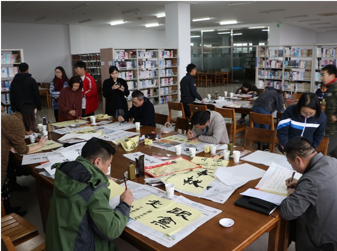 11月22日,校工会、由港口管理学院、校团委联系联合承办的“欢庆十九大,书画中国梦”现场书画大赛在图书馆二楼如火如荼地举行。来自各二级工会的十余名教师和各二级学院40余名学生参加比赛,校工会主席刘相、学生处副处长於国元、数字媒体艺术专业教师程舟珊和校团委副书记廉婧受邀担任评委。