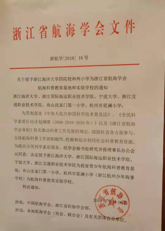 2019浙江航海学会任命我校浙江省航海科普教育基地